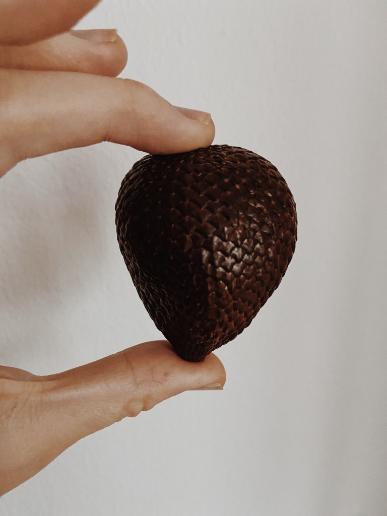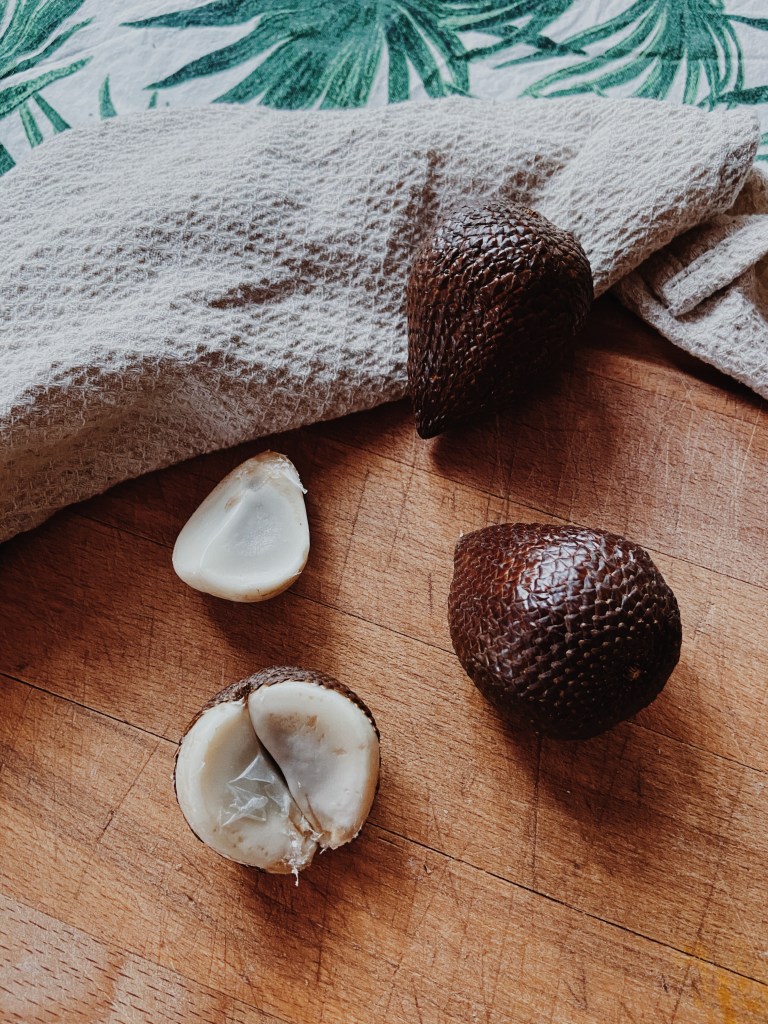There are different varieties of the salak, all of them look fairly similar though. While they are easy to find in Southeast Asia, it can be a bit of a struggle to find them in Europe. Asian supermarkets or specialized fruit vendors are your best options. I found mine in an organic supermarket with a large selection of exotic fruit. Sometimes you can find them pickled in cans too. When buying salak you need to pay attention to the skin, which should be reddish brown with no dark spots. The most expensive and sweet variety is the salak Bali which as its name suggests, can be found in Bali.