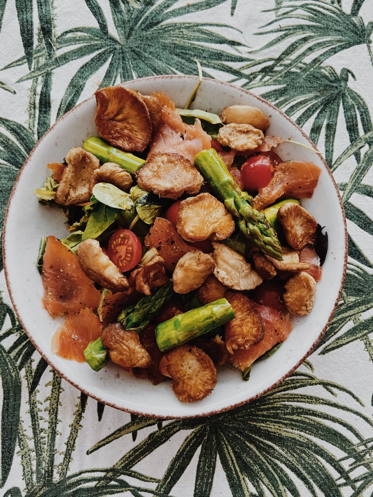 Pan-fried lions mane with asparagus, tomato and smoked salmon